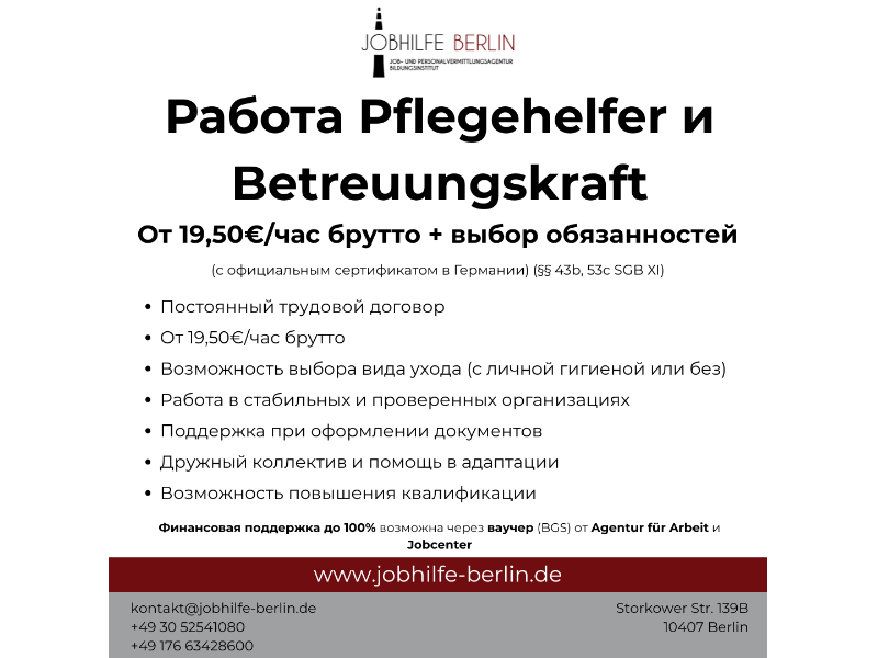 Вакансии в Берлине. Ищем помощников по уходу (Pflegehelfer/in), которые хотят стабильную работу и официальное трудоустройство в Германии. Даже если у тебя нет опыта мы поможем тебе пройти короткое 4-месячное обучение, после которого ты сможешь сразу начать работать! Что тебя ждёт: Работа с оплатой от 19,50 / час Немецкий трудовой договор и социальные гарантии Помощь с оформлением всех документов Возможность работать в больницах, домах престарелых или в уходе на дому Обучение длится всего 4 месяца и оплачивается Jobcenter / Agentur für Arbeit После обучения гарантированное трудоустройство Обучение длится всего 4 месяца и включает профессиональный немецкий язык и практику. *Важно: эта возможность доступна только для клиентов Jobcenter или Agentur für Arbeit, так как обучение полностью оплачивается этими учреждениями. * Старт уже в январе! Если у тебя уровень немецкого A2 этого достаточно, чтобы начать! Оставь заявку прямо сейчас и мы поможем тебе сделать первый шаг к стабильной работе и жизни в Германии!