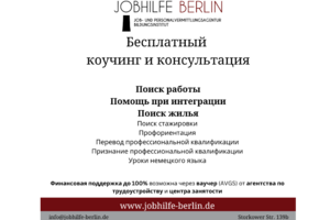 Мы предлагаем: Индивидуальный подбор вакансий по вашему опыту и желаниям Поддержку при составлении резюме и подготовке к собеседованию Помощь с подтверждением дипломов и документами Профориентацию и консультации по смене профессии Бесплатные курсы и обучение Сопровождение при изменении вида на жительство Важно: Вы должны быть зарегистрированы в Jobcenter или Agentur für Arbeit. Звоните нам прямо сейчас мы говорим по-русски и украински! Приём в офисе в Берлине. Услуги бесплатные по государственной программе финансирование.