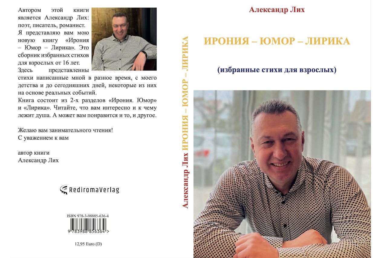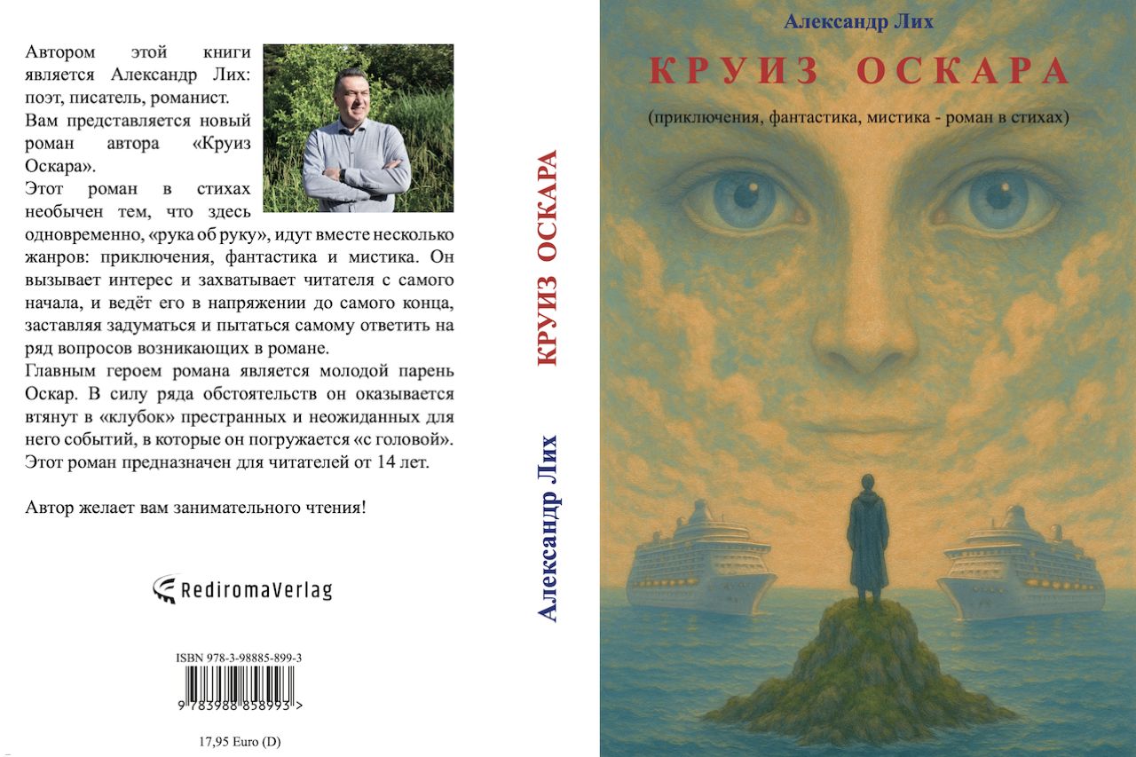 А. Лих: В январе 2025 года вышел мой сборник ироничных, юмористических и лирических стихов, который так и занывается «Ирония – Юмор – Лирика» (избранные стихи для взрослых). Это произведение рекомендуется читателям от 16 лет. Она состоит из 2-х частей: «Ирония – Юмор» и «Лирика». В ней 226 страниц. В августе 2025 года вышла уже следующая книга, которая называется «Круиз Оскара». Это мой новый большой роман в стихах, состоящий из 90 глав и 386 страниц. Жанр этого романа – приключения, фантастика и мистика. Предназначен для читателей от 14 лет.